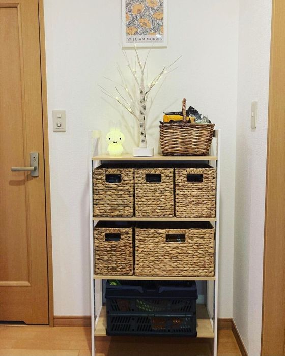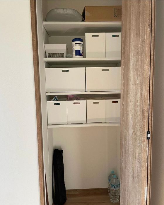 a____11.minさんは玄関横の納戸の中を、ニトリのNインボックスでスッキリと仕分けているそうですよ。ウェットペーパーやフローリングワイパーの詰め替えなどストック類はまとめて収納できて便利。ボックスのサイズや色が揃っているのでゴチャゴチャして見えず、来客時にも気兼ねなく開閉できそうですね。