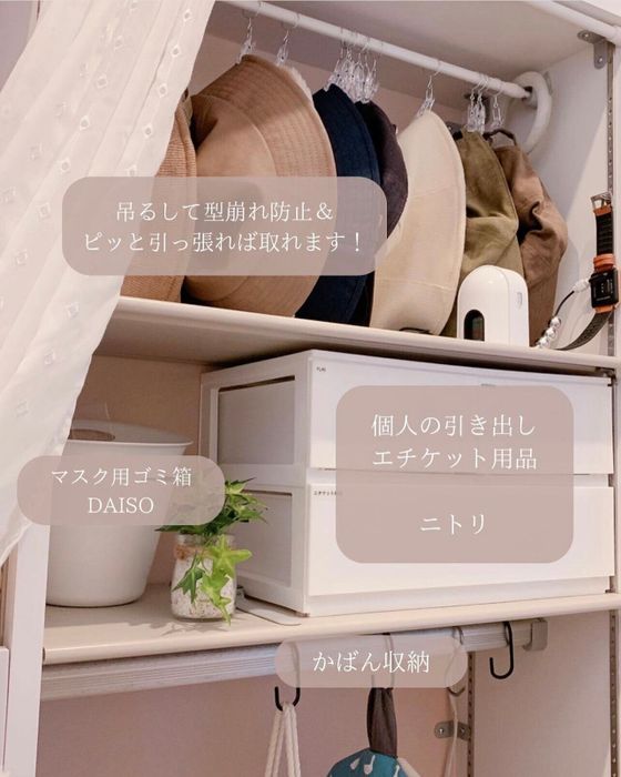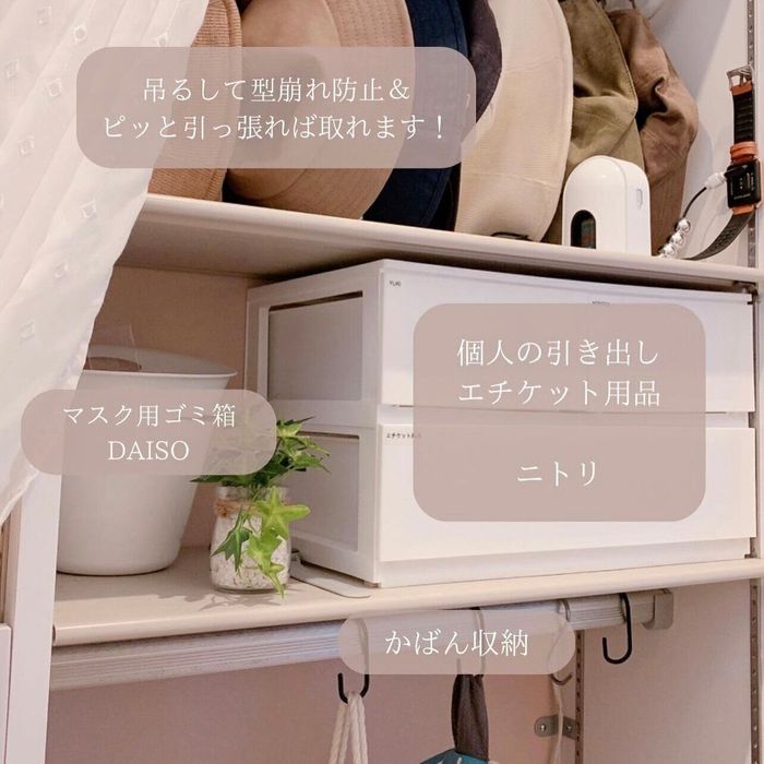 pon.no_ouchiさんはニトリで購入したコンパクトサイズの引き出しを、シューズクロークに導入したようです。こちらにはお出かけ時に必要なエチケット用品などを入れているんだそう。引き出しタイプはホコリの入り込みを防げるのがうれしいですよね。