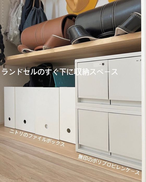 satomikoさんは玄関側のクローゼットをランドセル収納として活用。下段にはニトリのファイルボックスをセットして、教科書や絵の具などの収納として使用しているそうです。定位置が決まっているので小さいお子さんでも帰宅後のお片付けが簡単にできるんだそう。幼稚園・保育園の通園バッグや粘土板などの収納としても使えそうですよね。