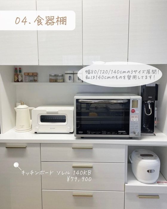 mashichiさんがニトリで購入したのはキッチンボードです。清潔感のあるホワイトカラーがキッチン全体を明るい印象にしてくれそうですね。横幅は80cm、120cm、140cmというサイズ展開の中、140cmを愛用中のようです。