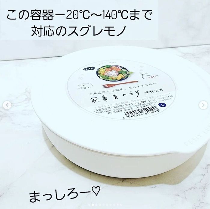 こちらはmika24angel_さんがセリアで購入した「家事をへらす保存容器」。冷凍保存はもちろん、電子レンジや食洗機にも対応しているそう。真っ白でシンプルなデザインが気に入り、サイズ違いでゲットしたそうです♪