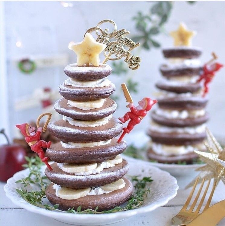 相性抜群のバナナとココアパンケーキで作るツリーケーキ。竹串で固定するテクニックで、高く積み上げても安定するんだそう。デコレーションのアイデア、参考にしたいですね!