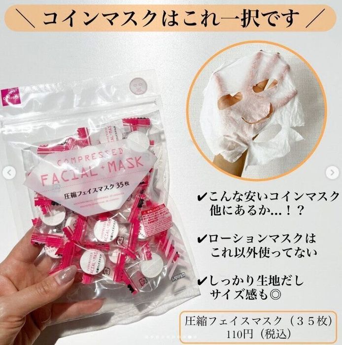 ちゃりこさんはダイソーで圧縮フェイスマスクを購入しました。しっかりした生地でサイズ感もばっちりなんだそうです! 35枚入りで110円というコスパも最高ですね♪ この方はローションを浸して使っているみたいですよ。個包装だから衛生的に使えるところもありがたいですよね!