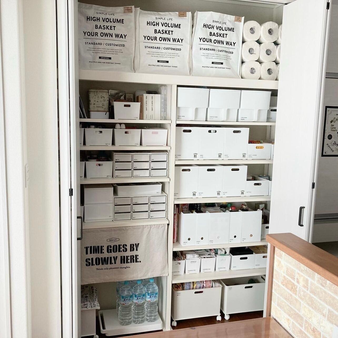 yocchanさんはご自宅のパントリーの中を、ニトリのファイルボックスとNインボックスで整理しているそうですよ。最下段はNインボックスにキャスターを取り付け出し入れしやすく、お掃除の際も移動がスムーズに。