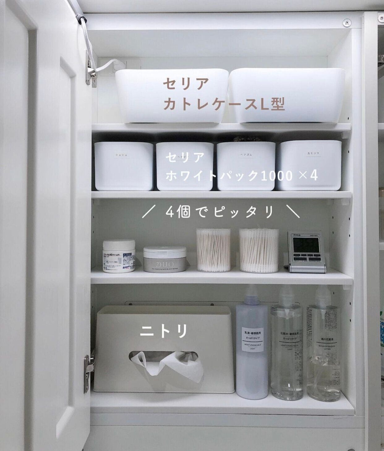 ドリさんはセリアのカトレケースL型やホワイトパック1000などの収納ケースを鏡裏収納に活用しています。セリアのホワイトパック1000は4個ピッタリはいるそう。とてもきれいに整頓されていますね。