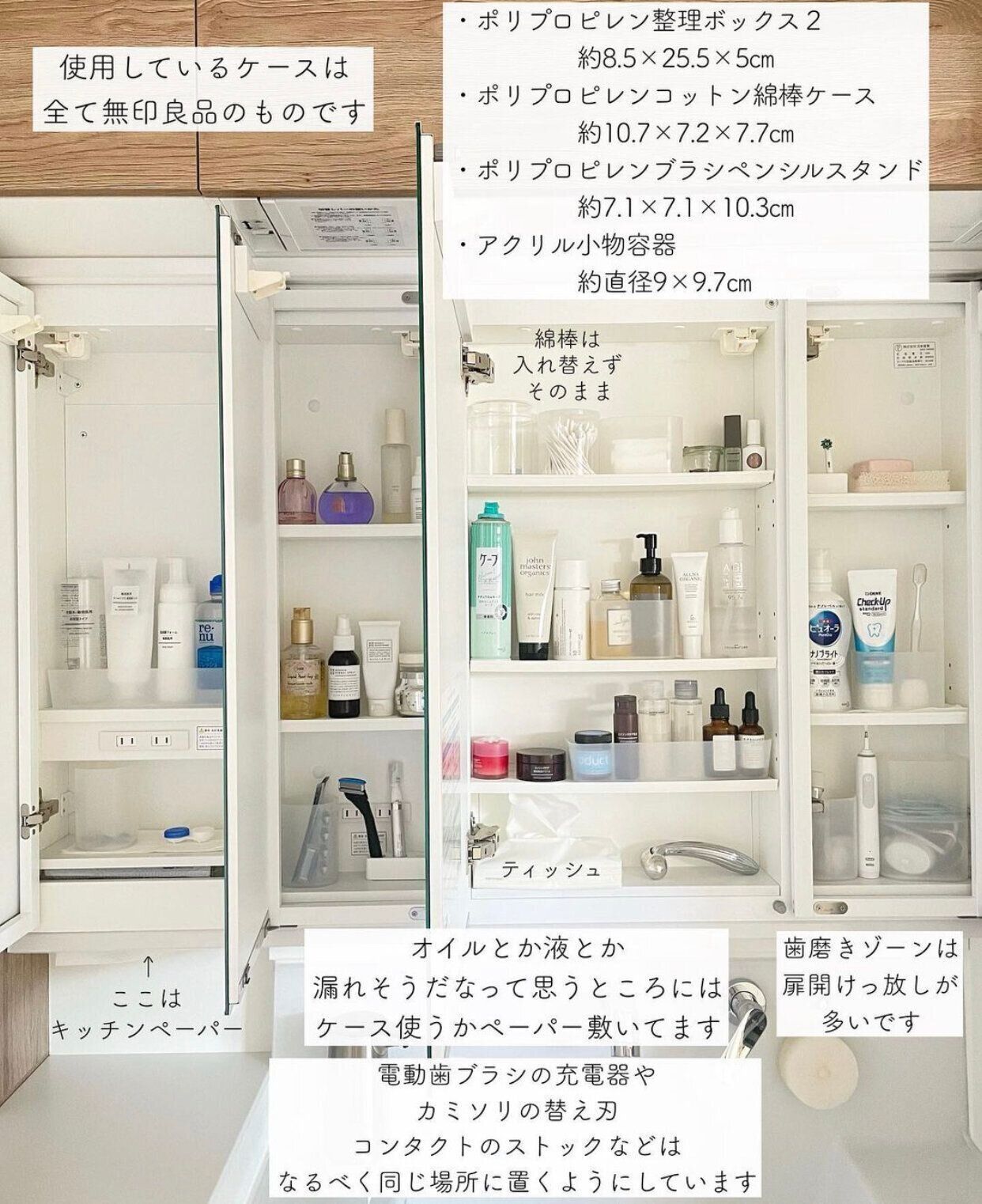 ともさんは無印良品の収納ケースを使い、鏡裏収納をすっきり整頓しています。オイルや液など、漏れそうなものはケースを使うかペーパーなどを敷いているそう。ケースも半透明でわかりやすいですね。