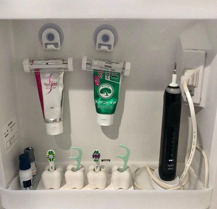 nococha527さんはセリアの収納アイテムを使い、歯ブラシや歯磨き粉を鏡裏に収納しています。歯磨き粉はクルクル絞りながら使うことができるので、最後まできれいに使い切ることができるそう。とても便利そうですね。