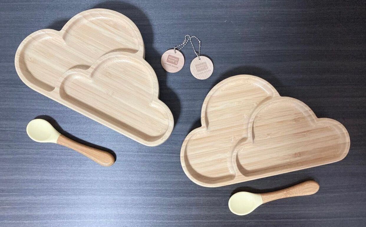 kurukurubabyさんはアマゾンで竹製のワンプレート食器を購入。ある程度深さがあるので使いやすく、裏にはシリコンのすべり止めを付けられるようになっているのだとか。想像以上にテーブルにしっかり固定してくれるそう。雲の形もおしゃれですね。