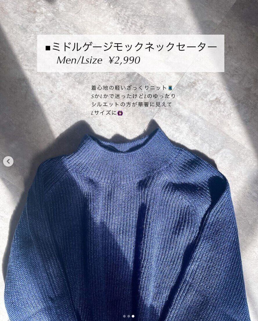 MAIKOさんは、ミドルゲージモックネックセーター(2,990円)を購入。SかLサイズで迷ったようですが、Lのゆったりシルエットのほうが華奢に見えて気に入ったので、Lをチョイスしたんだそう!着心地が軽く、色味も絶妙に可愛くてお気に入りなんだとか。彩度が低めの青なので、合わせやすそうですよね。
