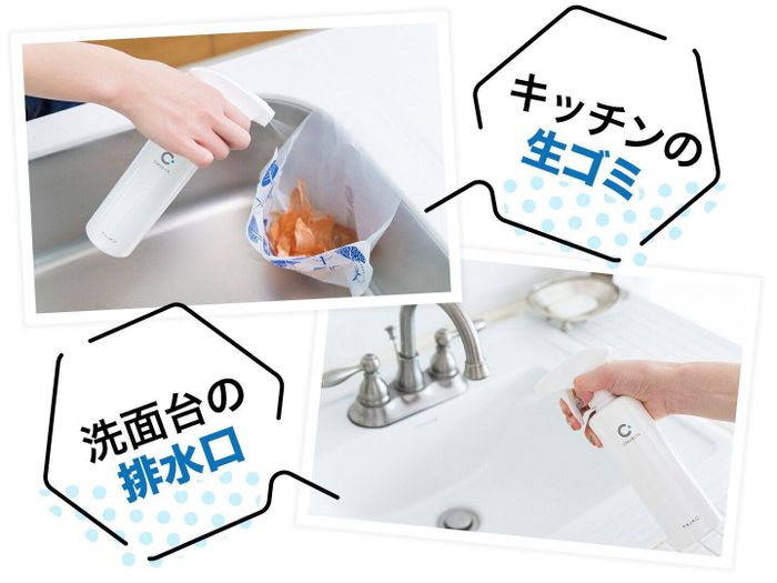 キッチン、浴室、トイレといった水まわりやゴミ箱など、ウイルスや菌、ニオイが気になるモノを狙い打ちできるスプレータイプ。