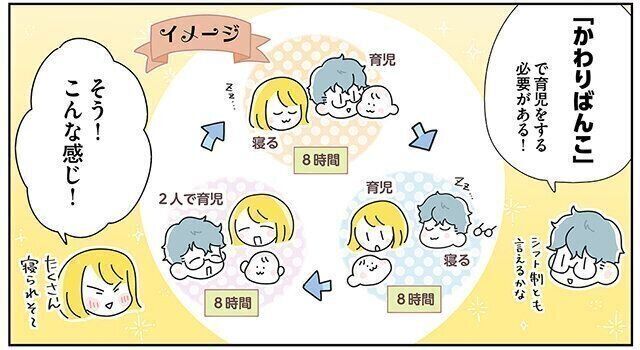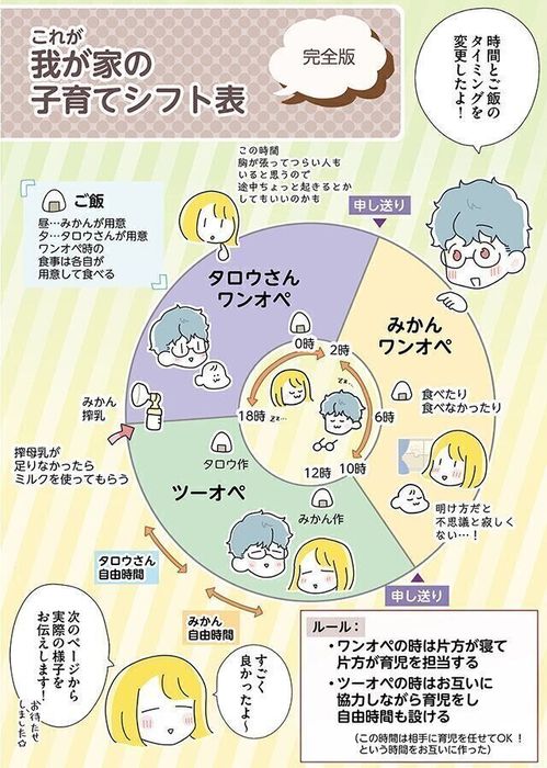 芳田みかん「1日を8時間ずつに3分割し、私が寝てタロウさんが育児をするシフト・私とタロウさんの2人で育児するシフト・タロウさんが寝て私が育児をするシフトを組みました。睡眠時間がもう少し短めでいいご夫婦でしたら2人の時間を長めにとるのもありだと思います」