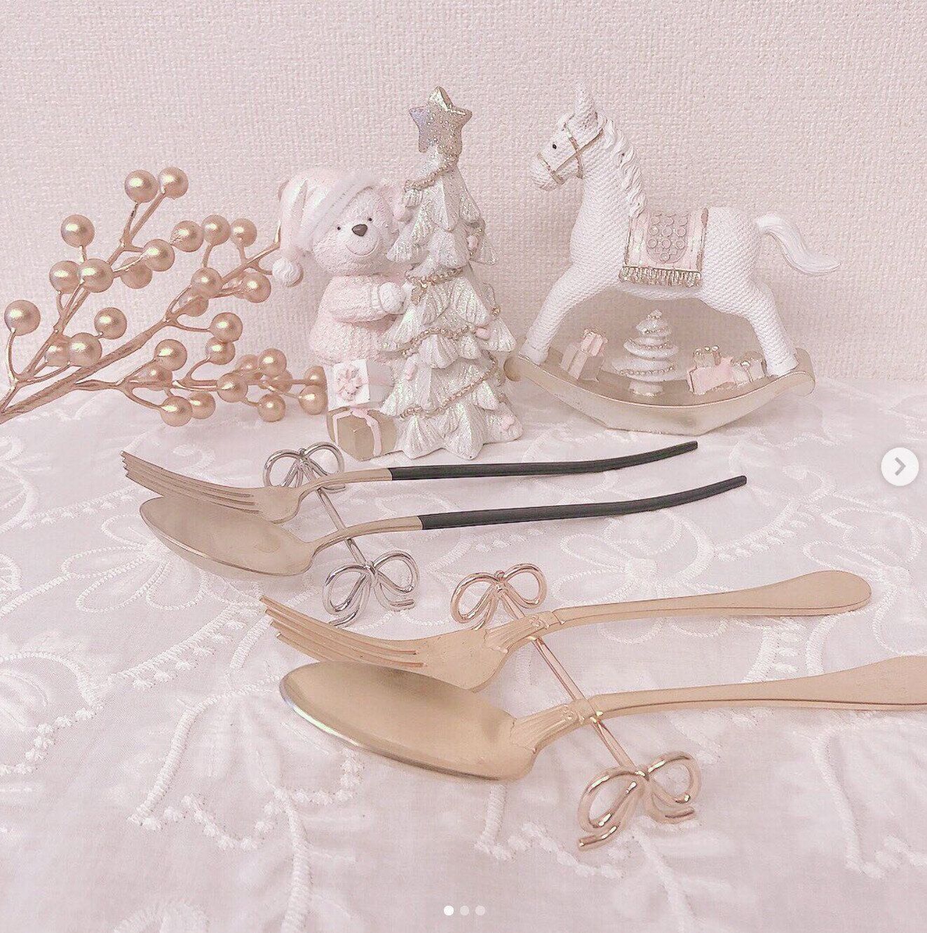 こちらはyu_ki_nooonさんがセリアで購入したカトラリーレスト。ゴールドとシルバーのものがあり、2つずつお迎えしたそうです♪ しっかりした作りで安定感もばっちりなんだとか。リボンモチーフがかわいいとお気に入りのようです。