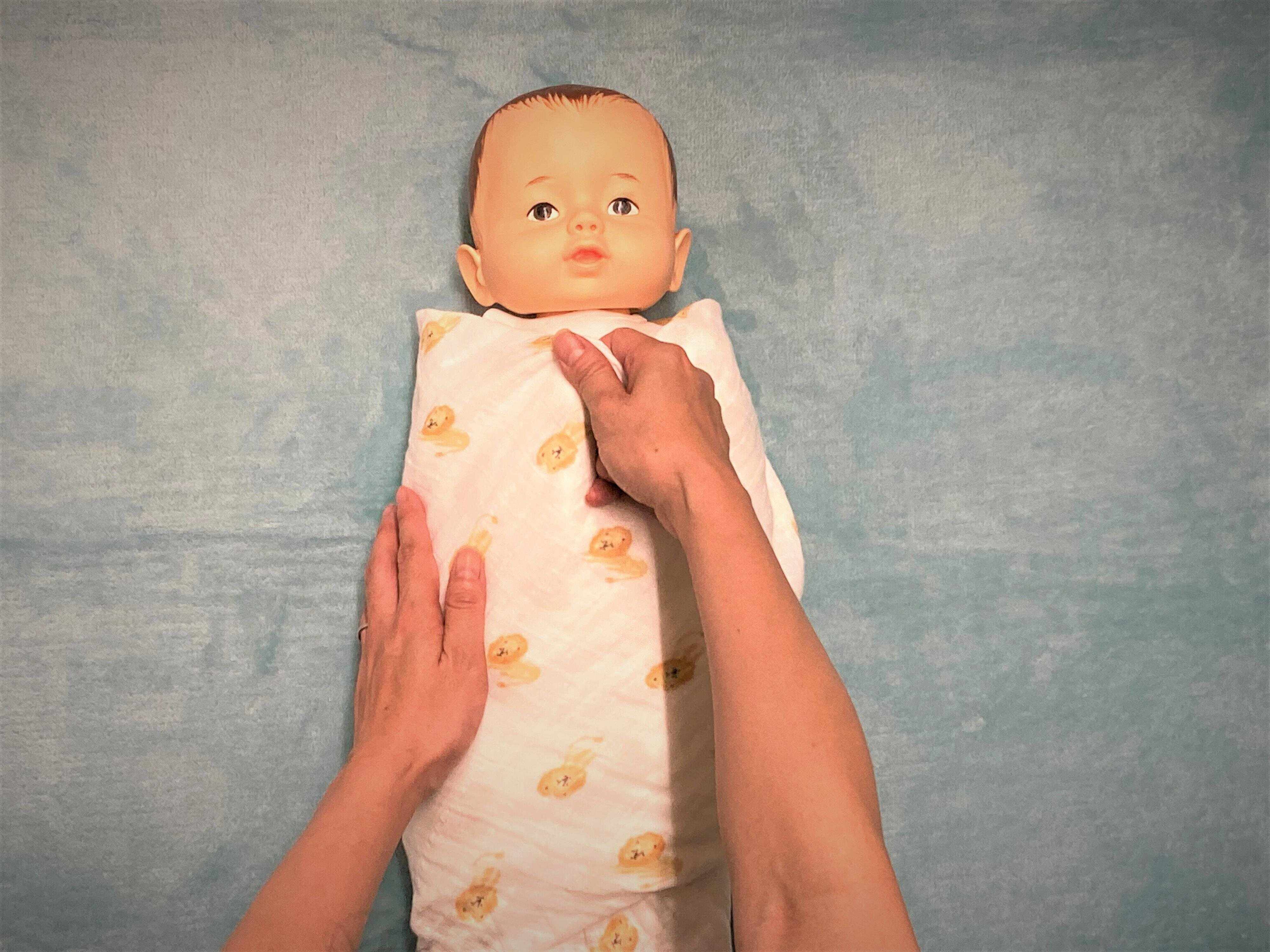 赤ちゃんの反対側の手も胸の上におき、おくるみを肩から体の下へと巻き込み、しっかりと固定したらできあがりです。