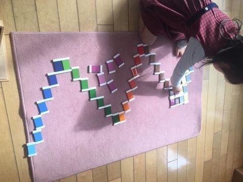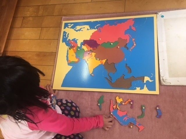 世界地図のパズルや色の濃淡が描かれた色板、数の概念を覚えるためのビーズが連結されたものなど、子どもたちはさまざまな教材の中から自分の興味のあるものを選び、思い思いに向かっています。