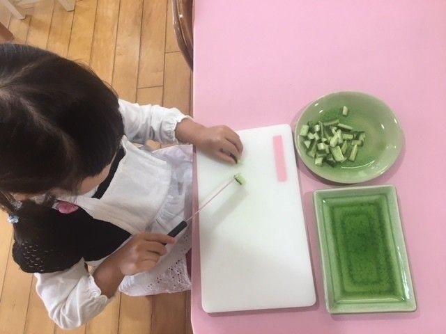 子どもたちが包丁できゅうりを切ったり、はさみで紙を切ったりする様子は、プレスクールでは日常の風景。つい「危ないから持たせたくない!」と思ってしまいますが、みんな器用に切っていて、危なっかしい様子は見られません。