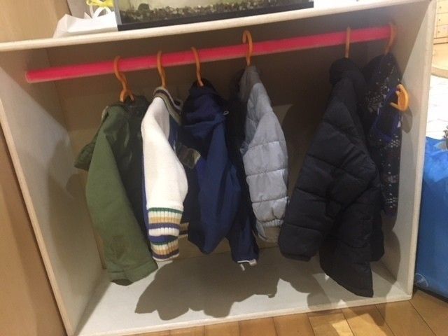 まず目に飛び込んできたのは、女の子の登園の様子。脱いだ上着をハンガーにかけて、ハンガーラックにしまっています。男の子は自分で上履きを履いています。子どもがなんでも1人でやって、保護者や先生は静かに見守っています。