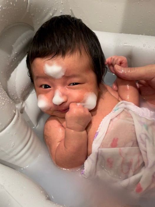 産後は里帰りをして、ばあばとじいじ、パパと4人で育児中。沐浴も連携プレーでスムーズに進み、琉衣も安心してバスタイムを満喫しています。
