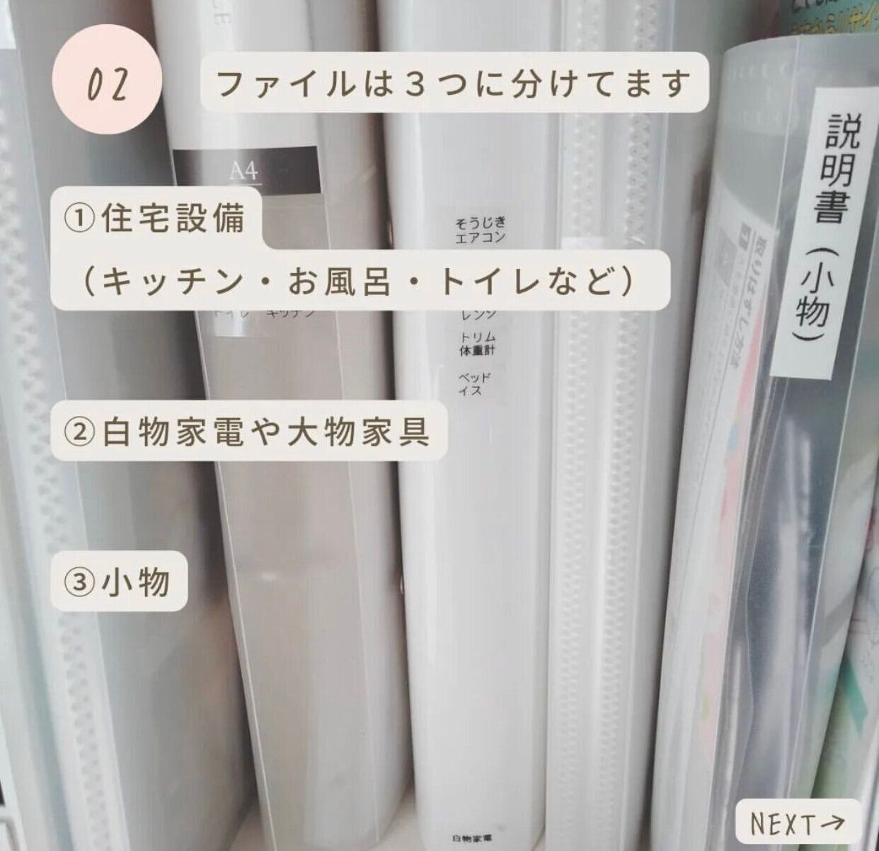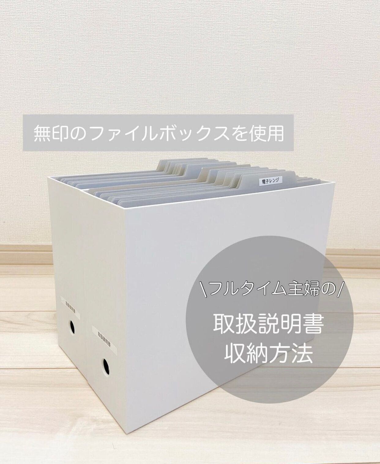 _yuu_home__さんは無印良品のファイルボックスとセリアの「個別フォルダーPP製」を使い、取扱説明書などの書類を収納しています。収納方法はとても簡単で、書類をセリアのフォルダにはさんでラベリングするだけなのだとか。とてもきれいに収納できていますね。