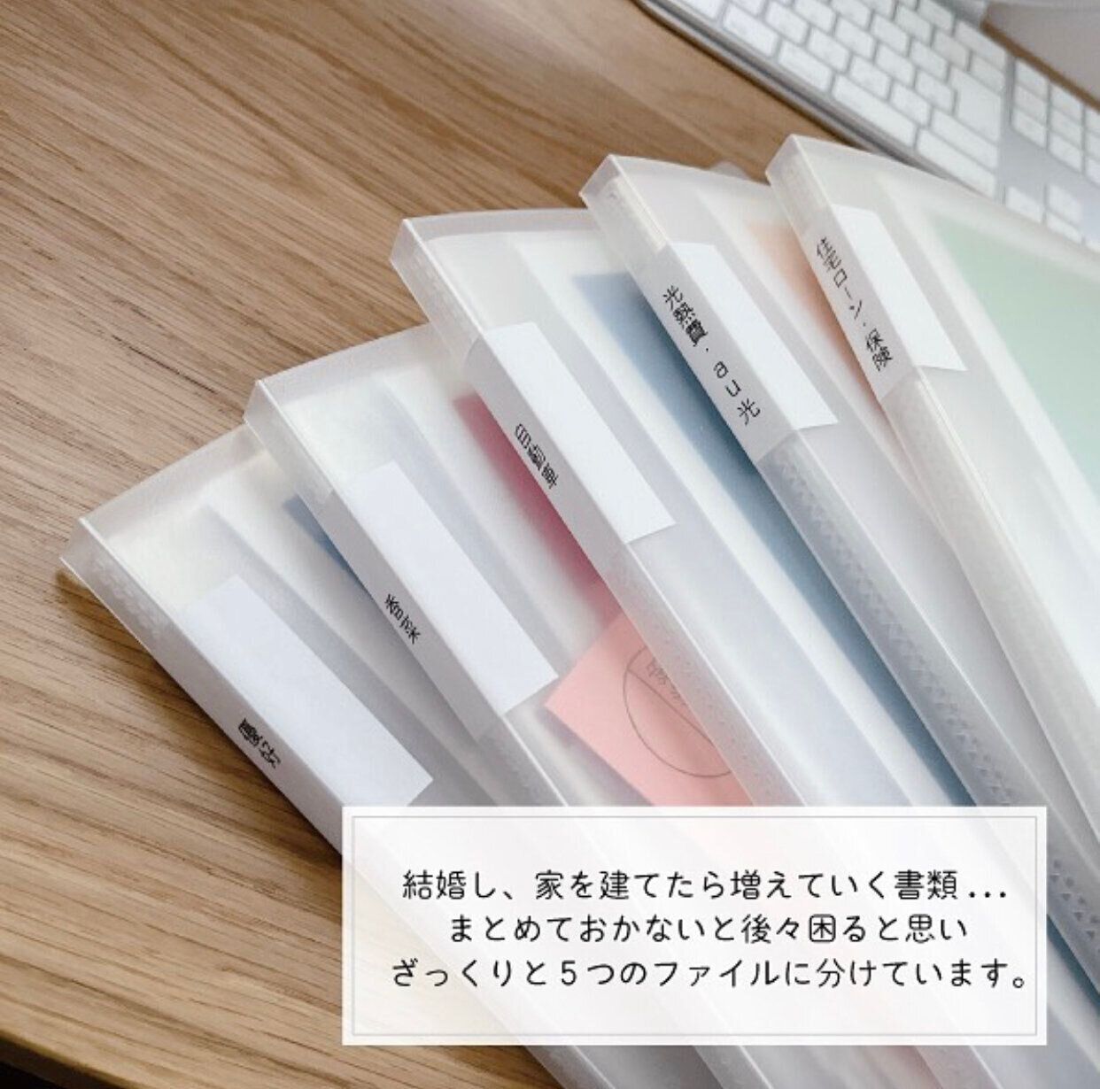 kkkkana223さんは無印良品のクリアホルダーにラベリングをして、書類を管理しています。書類をざっくり5つのファイルに分けているそう。郵便で書類が届いたときも、開封したらこのファイルへ入れているそう。シンプルでわかりやすいですね。