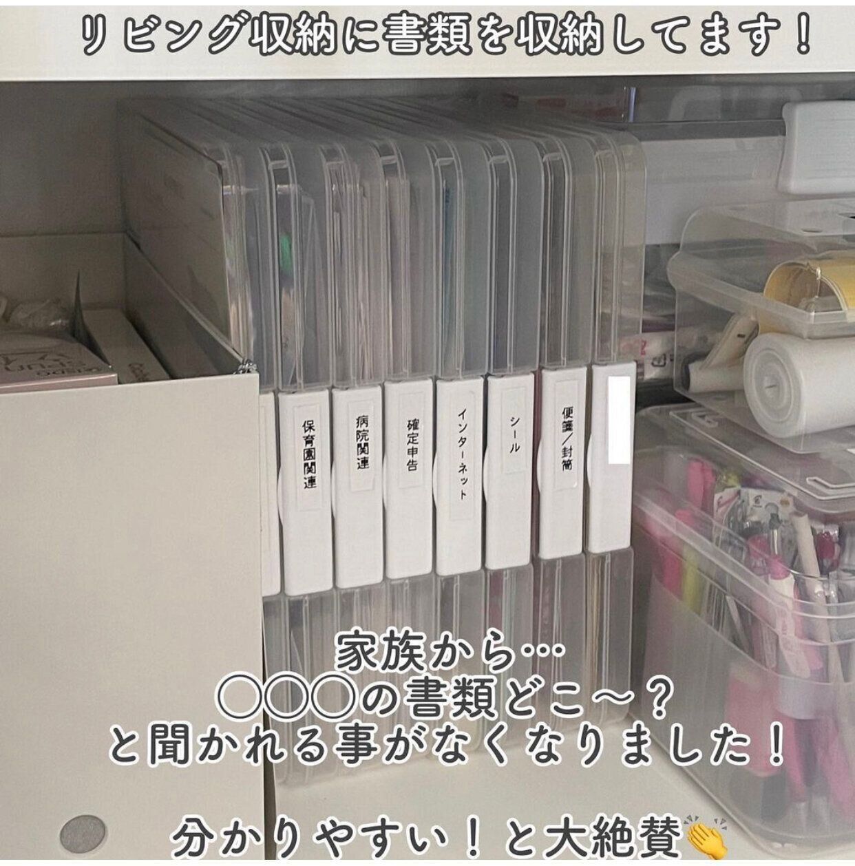 mm__ismartさんは、ダイソーの「すっきり書類収納ファイル」を使い、書類を収納しています。ざっくりとジャンル分けをして、家族みんながわかるようにラベリングをして取り出しやすいようにしているのだとか。とてもわかりやすい収納方法ですね。