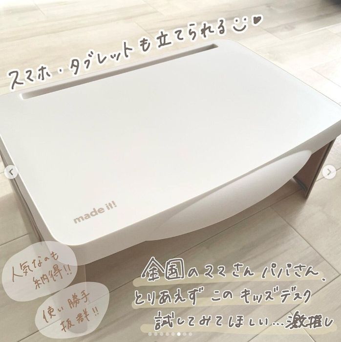 こちらはyucapoyo___rさんが3COINSで購入したKIDSデスク。子どもが使うのにちょうどよいサイズ感で、コンパクトに折りたたむこともできるのだそう。天板の下には文具などを収納するスペースもあるようです!こちらは1,650円商品とのこと。