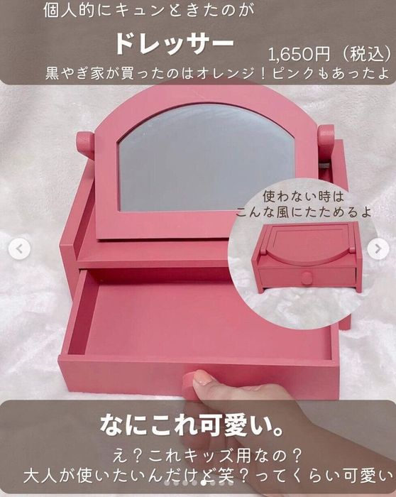 こちらはkuroyagi__sanさんが3COINSで購入したKIDSドレッサー。1,650円商品だったようですが、大人も使いたいくらいかわいいと気に入っている様子♪ 使わないときは、ミラーをたたんでコンパクトにもできるとのこと。