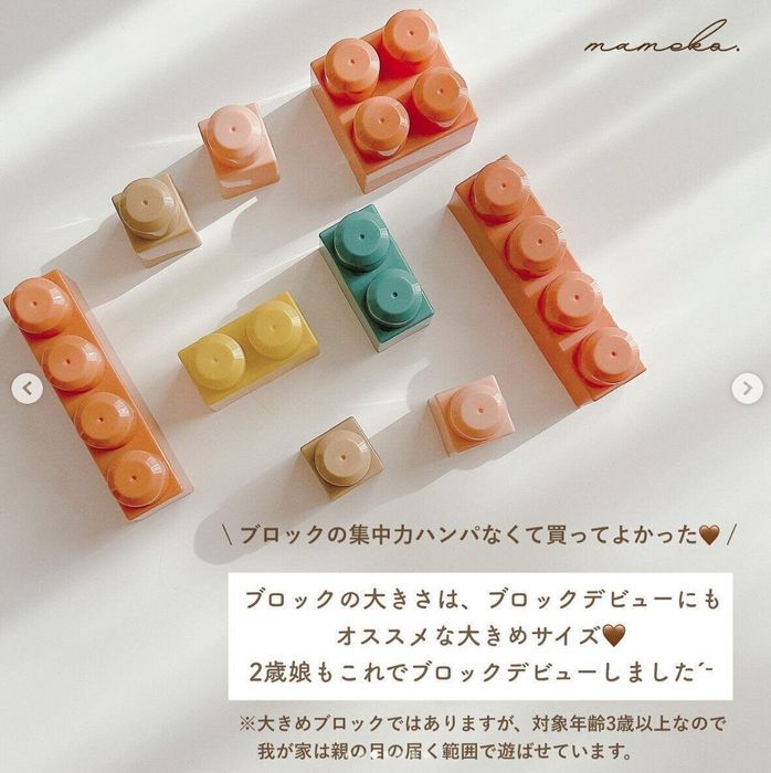 こちらはmamekooo__さんが3COINSで購入した「大きなブロック」。ブロック88個とふた付きのバケツがセットになっており、1,650円商品とのこと。集中して遊んでくれて買ってよかったと満足そうです♪ くすみカラーがかわいいですよね。