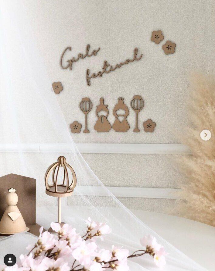 aiさんは、こちらの飾り付けを。壁にかけられた「ひな祭り 木製レターバナー」は、Airie(アイリー)で購入したんだそう。インテリアにも、ひな祭りフォトにもピッタリですよね。赤ちゃんのねんねフォトにもおすすめとのこと。コレさえあればひな祭り感がグッとでますね♪