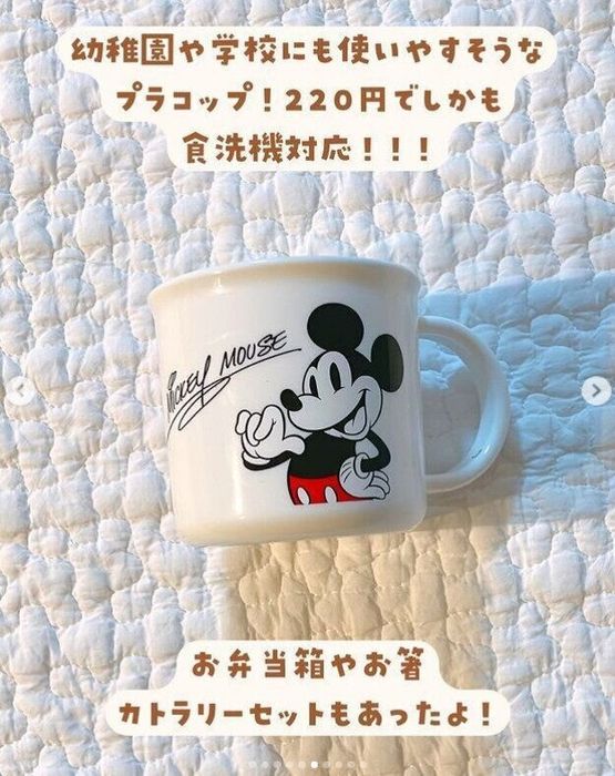 みゆさんはキャンドゥで幼稚園や学校でも使いやすそうなミッキーのプラコップをGET! 食洗機対応なのもうれしいポイントなんだとか◎ ほかにもお弁当箱やカトラリーセットも販売されてるようで、同じシリーズでお弁当グッズをそろえるのもよさそうですよね♪