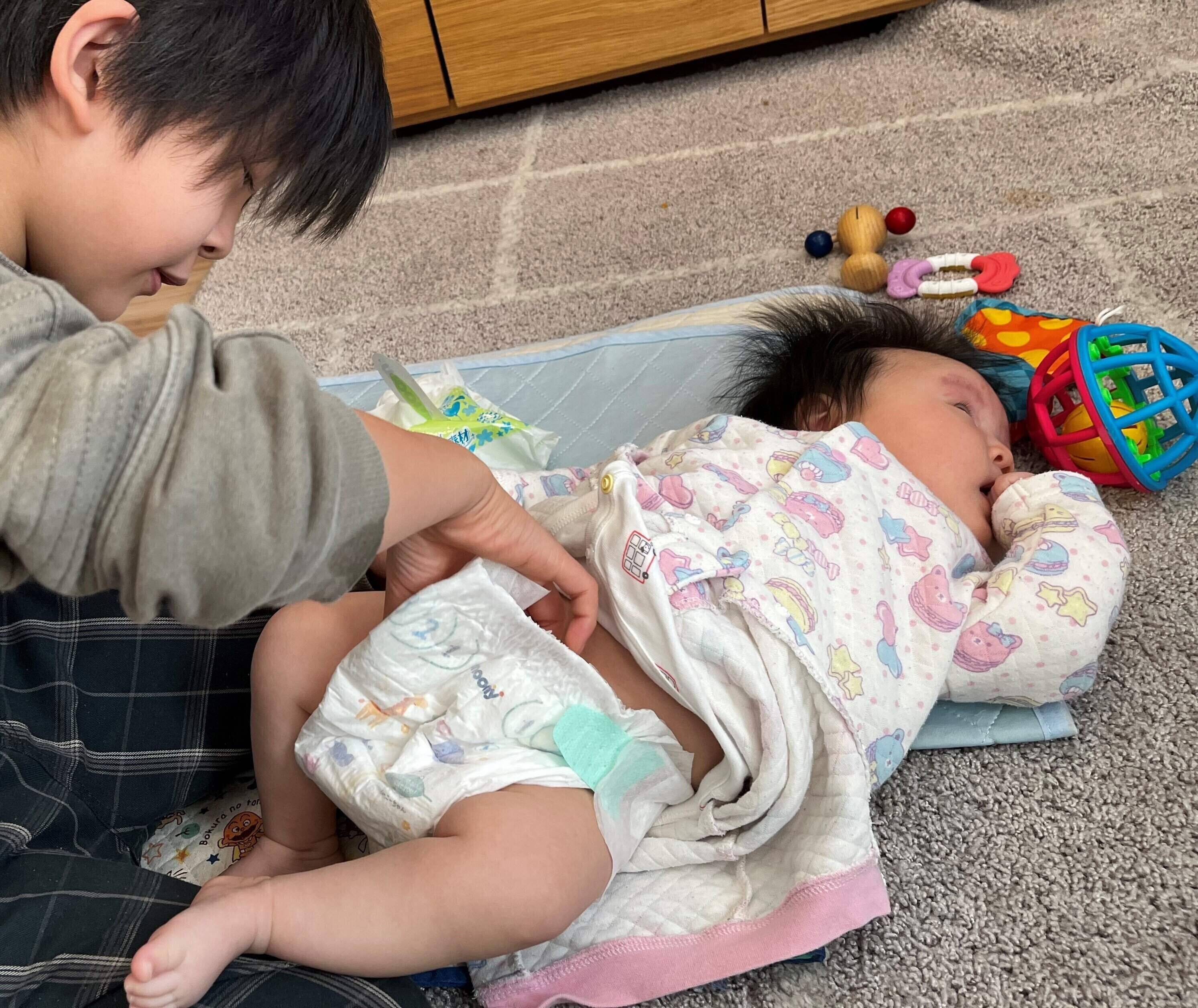 【産後3~4カ月】お兄ちゃんがおむつ替え!妹のお世話を手伝ってくれる