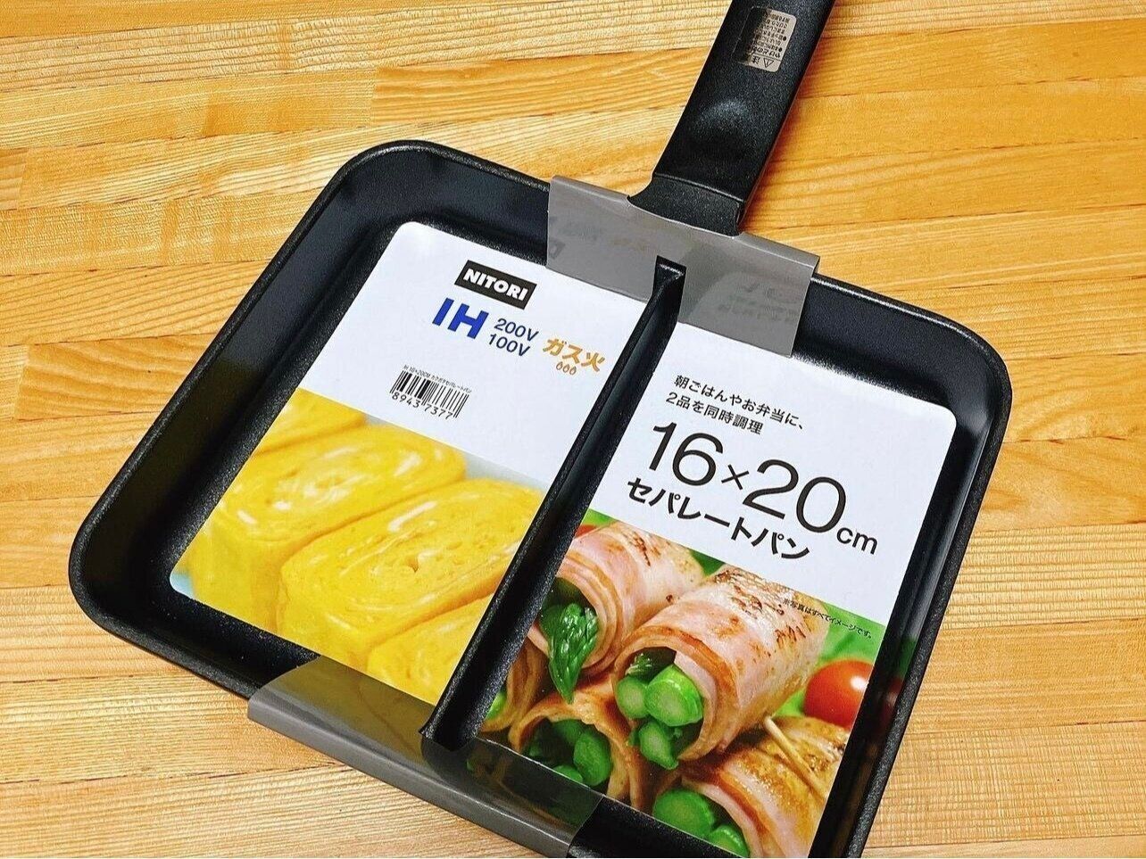 みかんさんがお友達にプレゼントしてもらったのはニトリで販売されている、セパレートタイプのフライパンです。一度に2種のおかずを調理できるので、朝食の支度やお弁当作りに役立ちそうですよね。洗い物が少なく済み、コンロも一口しか使わないので光熱費の節約にも。