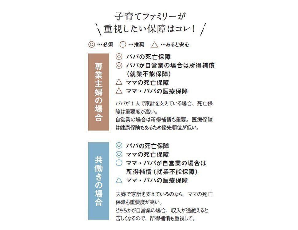 保障の対象となる人(被保険者)が契約した期間内に死亡した場合に、契約時に決めた「保険金額」を受け取れるのが死亡保険。家計を支えているパパやママに万が一のことがあった場合の、子育てに対する経済的不安を支えるためにも加入を。とはいえ、遺族年金など公的保障もあるため、保険のかけすぎには注意しましょう。子どもが独立するまでなど、一定の期間だけ保障する定期保険や、収入保障保険もおすすめです。