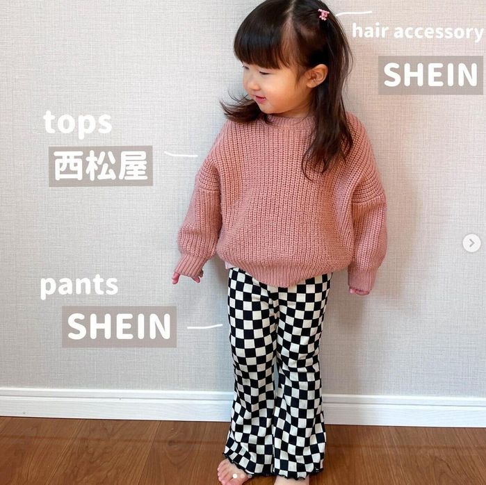 こちらはNATSUさんセレクトのコーディネート。西松屋のニットにチェッカーパンツを合わせたんだとか♪ 可愛らしいピンクのニットも、ボトムスのデザインによってはいろいろな雰囲気で着られそうですね!