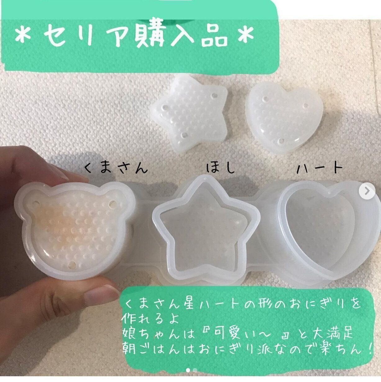 こちらはkasumis00uu1116さんがセリアで購入したおにぎりメーカー。朝ごはんのおにぎり作りに重宝しているとのことですが、小さめサイズのようなのでお弁当にもちょうどよさそうです♪ かわいい形のおにぎりが作れてお子さんも満足そうなんだとか。