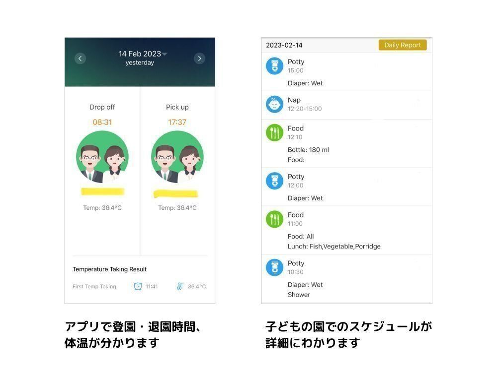 「園でランチは魚だったから夜はお肉にしよう」とか「今日はうんちがしっかり出たな」「お昼寝も十分に取れているな」と、子どもの健康状態も把握できます。