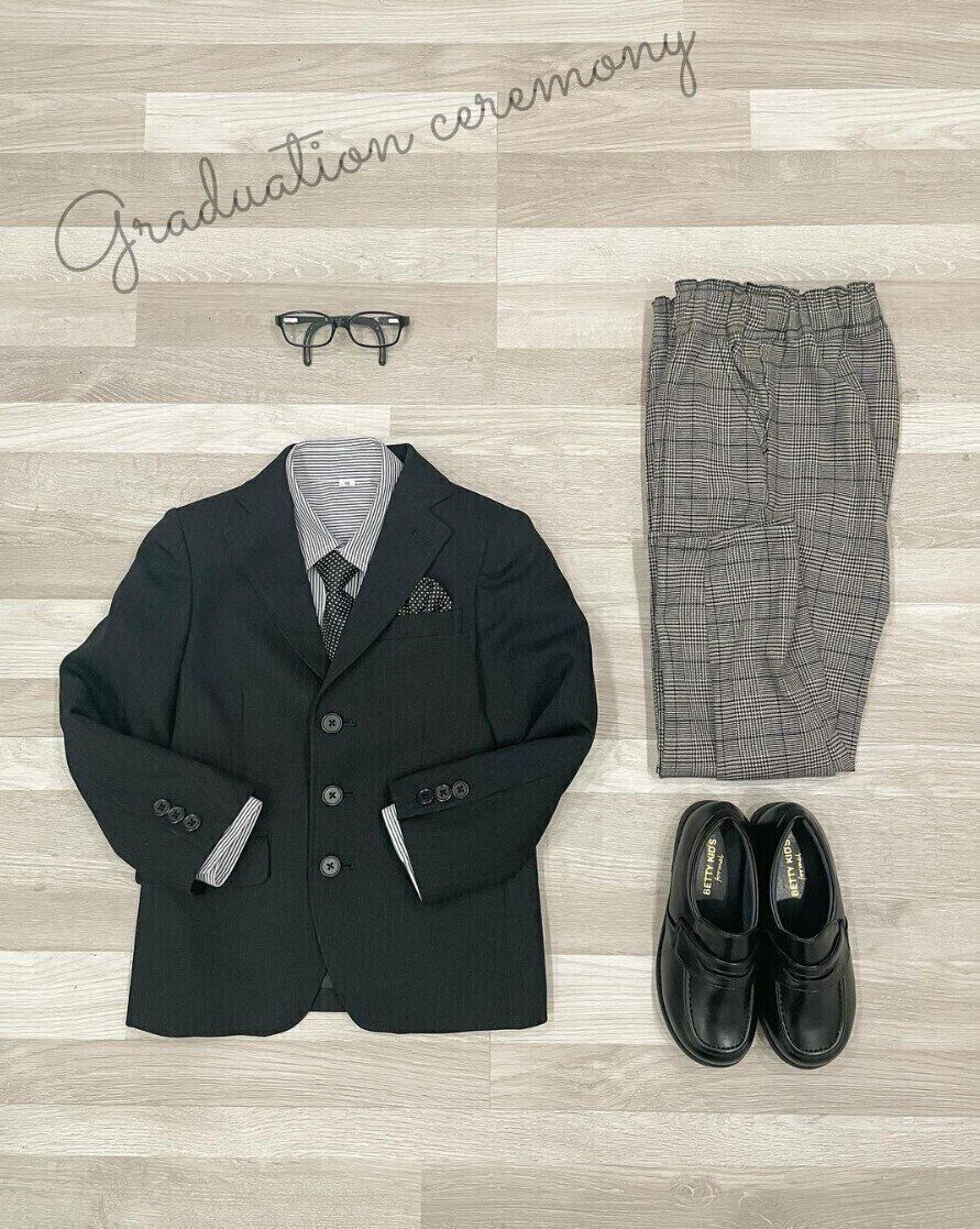 shokoさんは、卒園&入学式にこちらのコーデを着ていく予定なんだそう。いとこから、おさがりのジャケットをいただいたんだとか。ストライプのシャツと、黒ドットのネクタイを合わせてみるようですよ。パンツは普段使いできるものを。ローファーと長めの靴下も準備OKなんだとか。シックで素敵なコーデですね♪