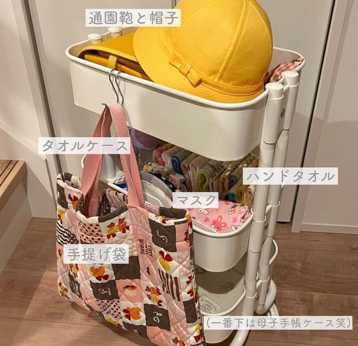 is__m.homeさんは IKEAのワゴンに園グッズをひとまとめにしています。園グッズを全てひとまとめにしたことで、外した名札が行方不明になったり、マスクや水筒を忘れることもなくなったそう。来客時はそのままクローゼットに入れて隠すこともできるのだとか。とてもよいアイデアですね。