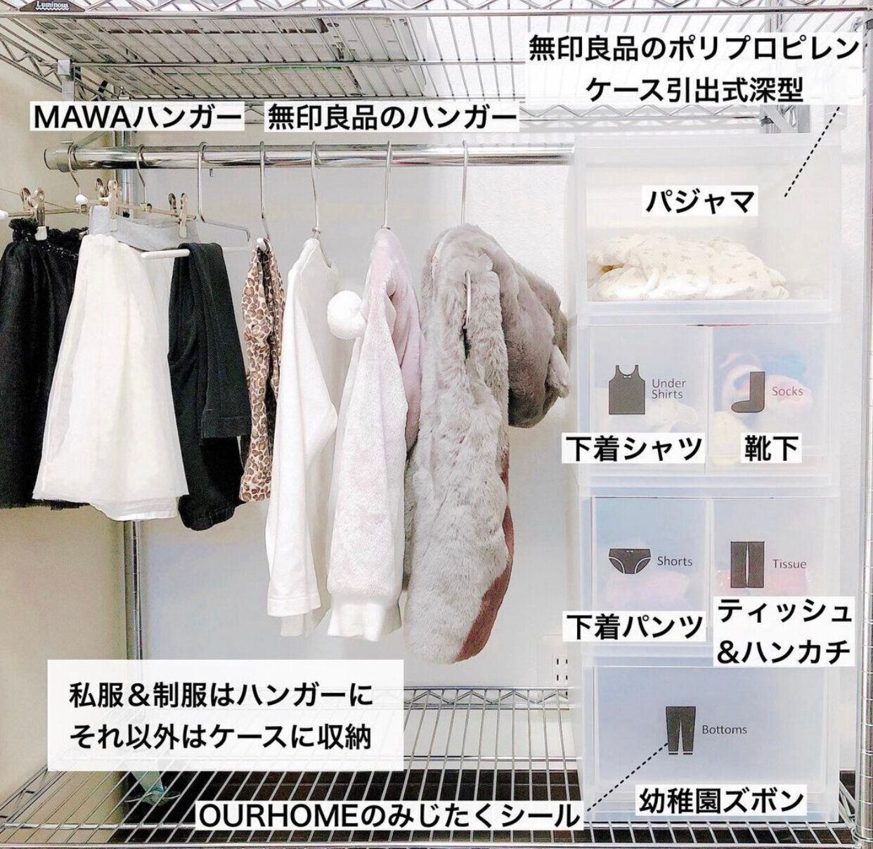 oshakosoさんは無印良品のハンガーや収納ケースなどを身支度コーナーに使っています。引き出しにシールなどを貼り、子どもたちが自分で身支度したりお片付けしたりできるようにしているそう。わかりやすく、きれいに収納されていますね。