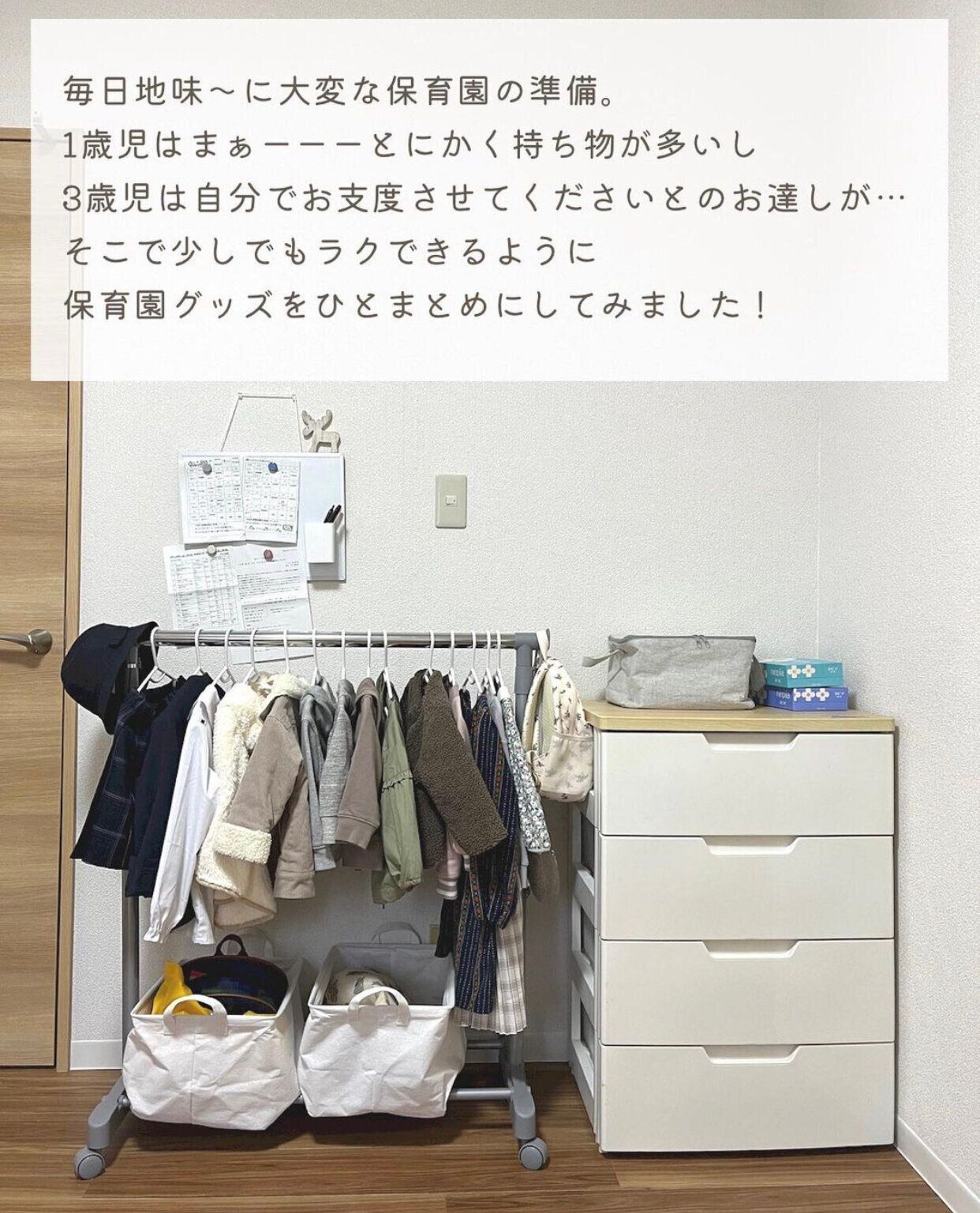 ahiru_no_ouchiさんは1歳と3歳になるお子さんの保育園グッズをひとまとめにして、毎朝支度しやすいようにしています。お洋服などはハンガーラックにかけ、シーツや体操服などはチェストに入れているそう。ここに座れば一歩も動かずに準備をすることができて、かなり時短になったようです。便利そうですね。