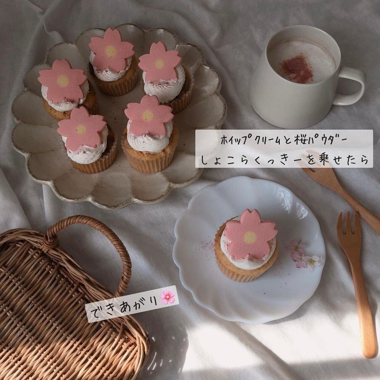 Aiさんはマフィン生地にKALDIの「さくらの花フレーク」を混ぜてさくらマフィンを作ったそうですよ。焼きあがったら粗熱をとって、ホイップクリーム、さくらの花フレーク、同じくKALDIで購入した「桜しょこらくっきー」をトッピングしたらできあがり!