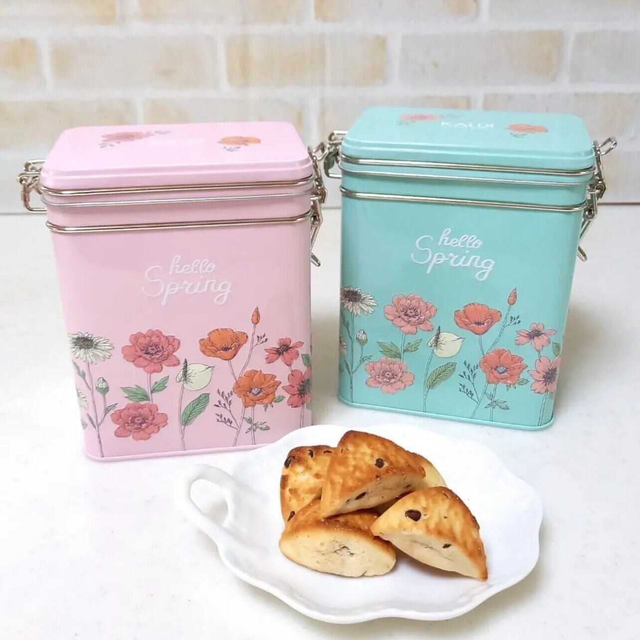 naoさんはKALDIでスプリング缶を2種購入したみたいですよ。春らしいパステルカラーとフラワーデザインが素敵♪ 中にはミニサイズのチョコチップスコーンが入っているみたい。コーヒーや紅茶用のキャニスターとしてキッチンに置くのもよし、インテリアとして飾ってごちゃごちゃしがちな細かいものをしまうのも◎。