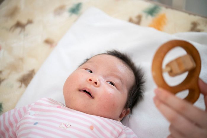 無事に1カ月健診も終えた山之内周音(あまね)ちゃん。顔の近くでおもちゃを動かすとじっと見つめるなど、いろいろな反応が増えてきました。