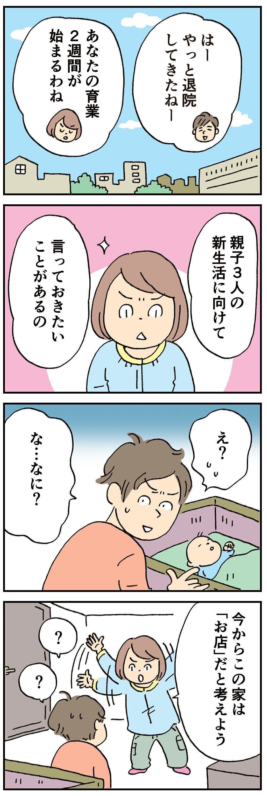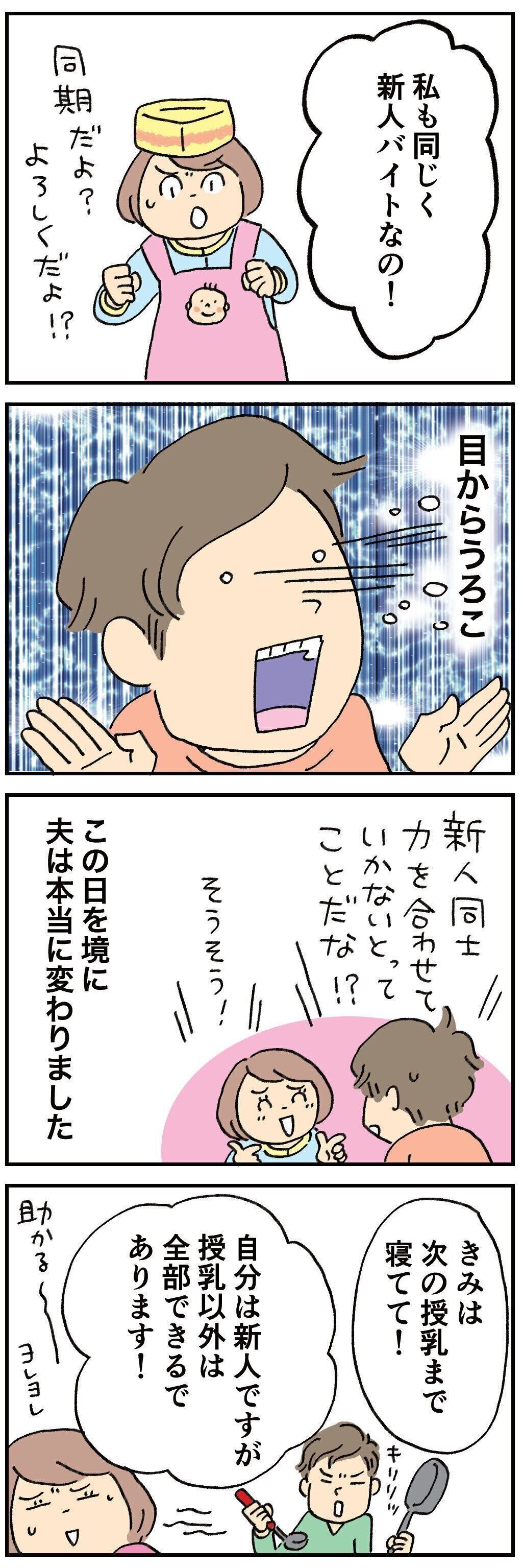 産後退院してからまず夫に「私は1週間前に入社した新人バイトで、あなたは今日入社の新人バイトであって私が店長、あなたが新人ではなくてどちらも新人バイトだから2人で協力して正社員目指そうね!」と話したらとても理解してくれて(続く)⁰#我が家の育業ストーリー⁰@tamahiyo_editor