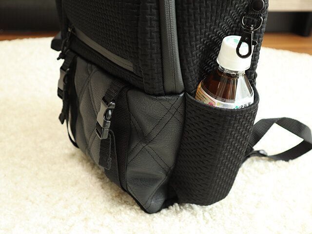 外側にはポケットが正面に2つ、両サイドに2つあります。水筒やペットボトルを入れるポケットはもはや必須ですよね。正面にバックルが2個ついているのでブランケットやシートなどを丸めて取り付けてもよさそう。アウトドアに強いワークマンならではの機能ですね。