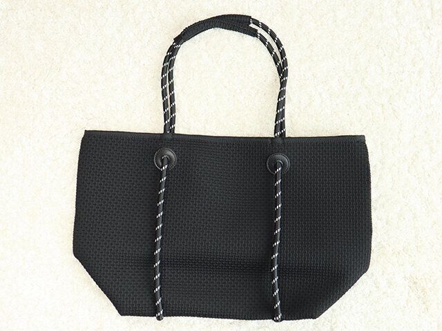 同素材の「SBR トートバッグ」(税込2,900円)もマザーズバッグとしておすすめ。肩から掛けられる大きめのトートバッグで、広めのマチが付いていて中身を入れると自立します。取っ手が細めなので肩に食い込みそうだなぁと思いましたが、実際に使ってみたらフカフカの当て布が付いていたので痛くありませんでした。