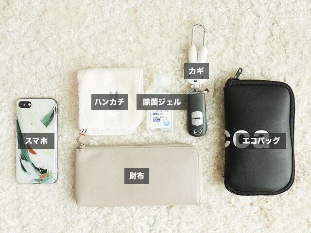 私がふだん持ち歩いている貴重品類はこんな感じ。スマホ、財布、ハンカチ、除菌ジェル、カギ、エコバッグ。これだけあると小さめのサコッシュには全部入り切らないんですよね。