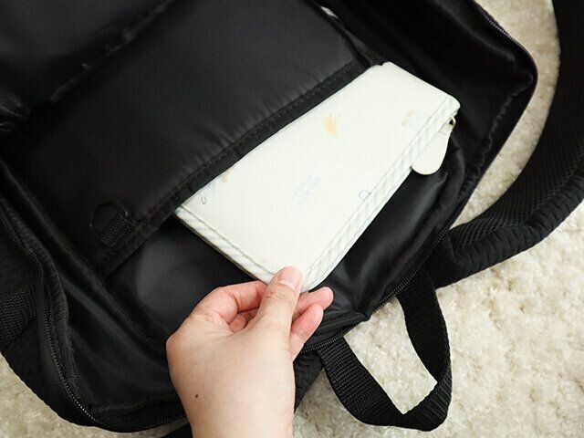 まず驚いたのは、中身の見やすさ・取り出しやすさ。私はふだん別のマザーズリュックを使っているのですが、リュックの底の方にある物が見づらくて上のものを全部出してから奥に入っているものを取っていました。これが地味にストレスだったんですよね……。でもこのリュックは、上部がコの字型にベロンと開くので、底にある物も見やすくてめちゃくちゃ取り出しやすかったです。