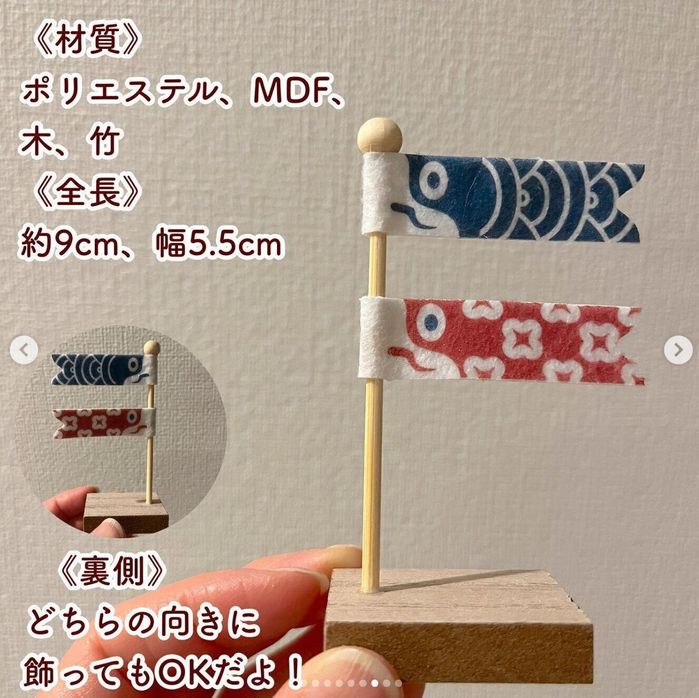 こちらはbell.100yen_happy_lifeさんがセリアで購入した「ミニこいのぼり スタンド」。こいのぼりが両面に印刷されているので向きを気にせず飾れるのだそう。派手すぎない色味がおしゃれですよね。
