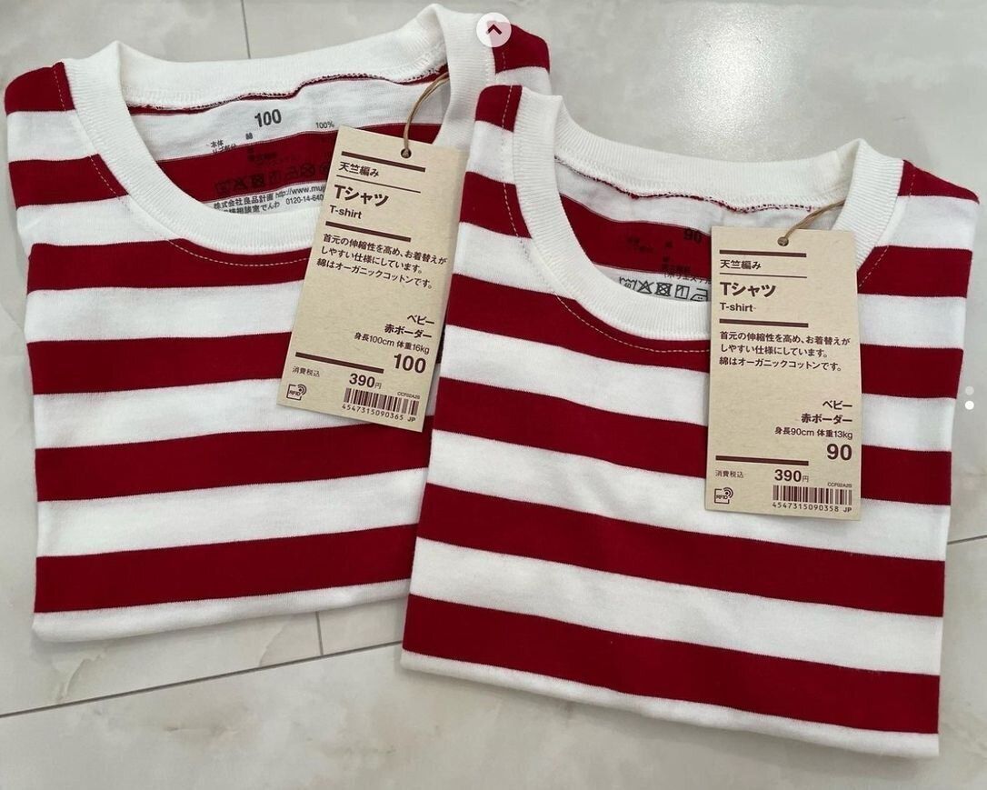 anj_krn1922さんは無印良品の「天竺編みTシャツ」を2枚GET!それぞれサイズは90cmと100cmだそうで、赤色のボーダーがカジュアルでおしゃれですよね。それぞれ価格は390と、プチプラなのも魅力的です♪
