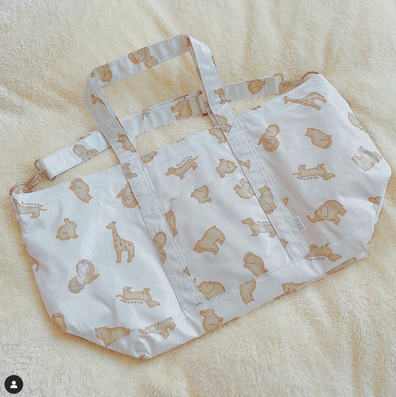 こちらはrinoさんがgelato pique(ジェラート ピケ)で購入したバッグ。最寄りの店舗で閉店セールをしており、定価の3分の1ほどの値段でゲットできたんだとか!ビスケットみたいな動物柄がかわいいと気に入っているようです。ショルダーストラップ付きで使い勝手もよさそうですね◎